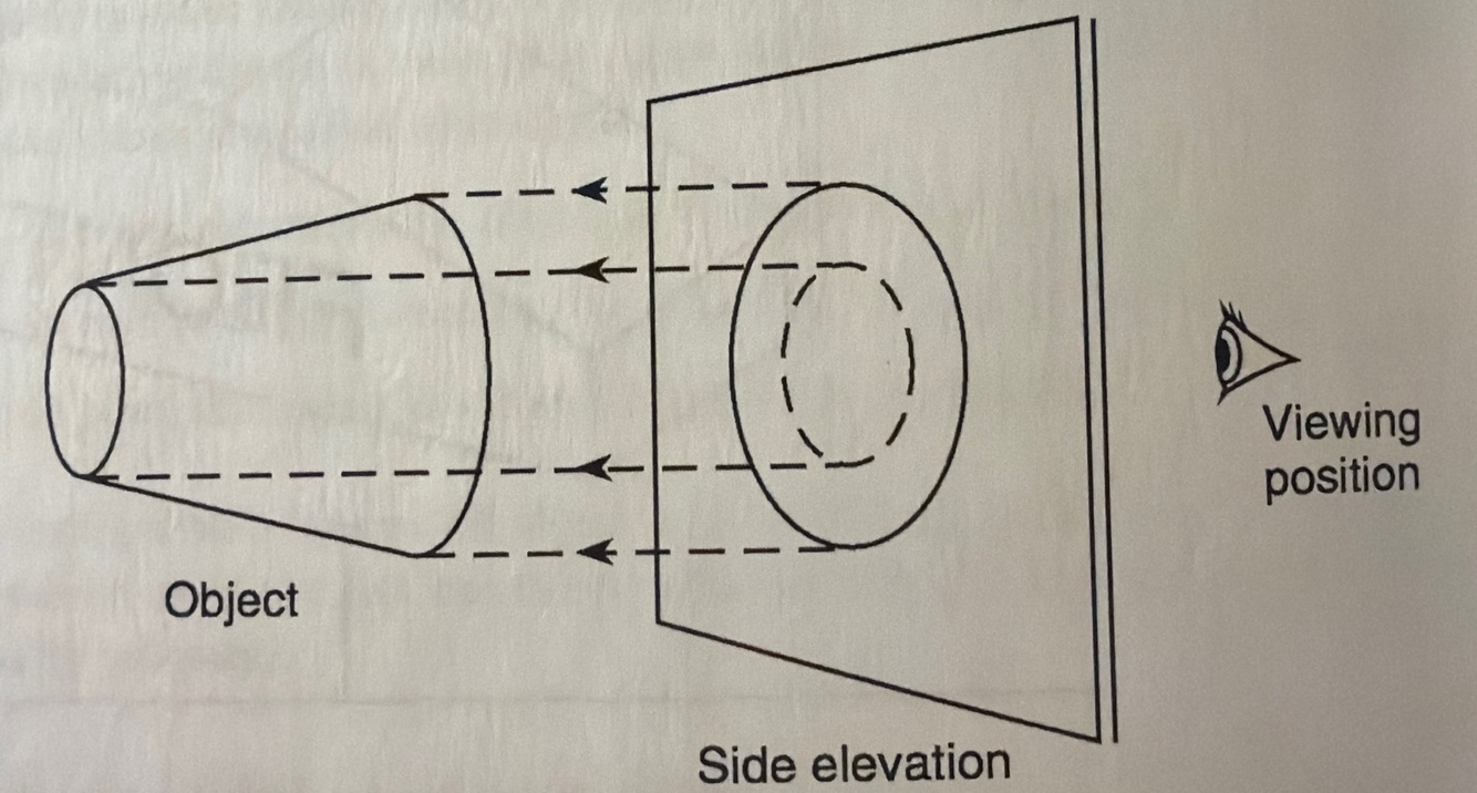 In an orthographic drawing what direction is the object viewed from in the front elevation