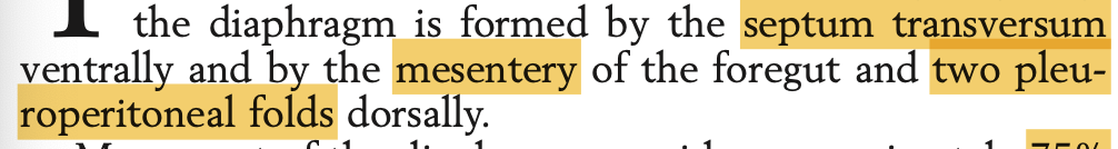 The diaphragm is embryologically formed by the septum transversum, pleuroperitoneal folds, and mesentery of the foregut.
