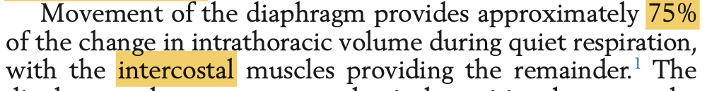 Diaphragmatic contraction contributes ~75% of the change in intrathoracic volume; intercostal muscles contribute the rest.