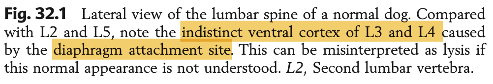 The right and left crura of the pars lumbalis attach to the cranial ventral border of L4 and the body of L3.