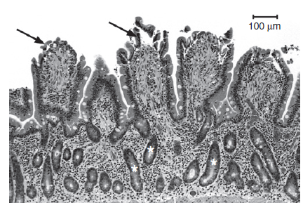 intestine, a fluid-filled space termed Grünhagen space forms at the tip of the villus. The fluid accumulation