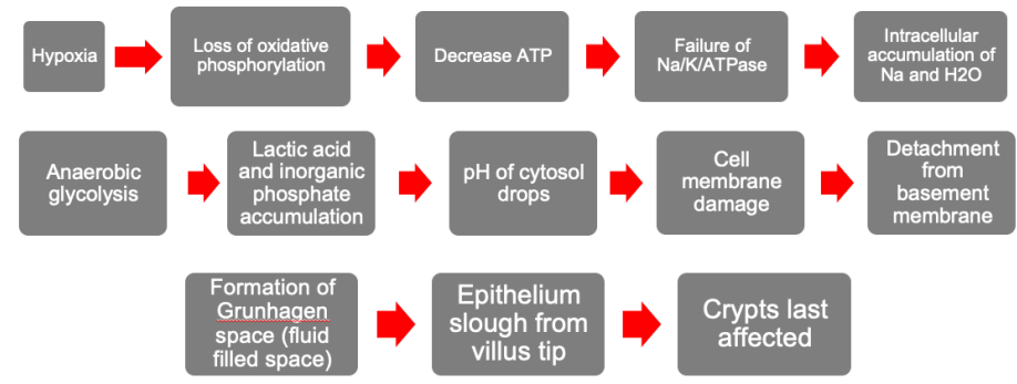 Explain the mucosal epithelium hypoxic injury process with diagram starting with hypoxia/anaerobic glycolysis/formation of Grunhagen space