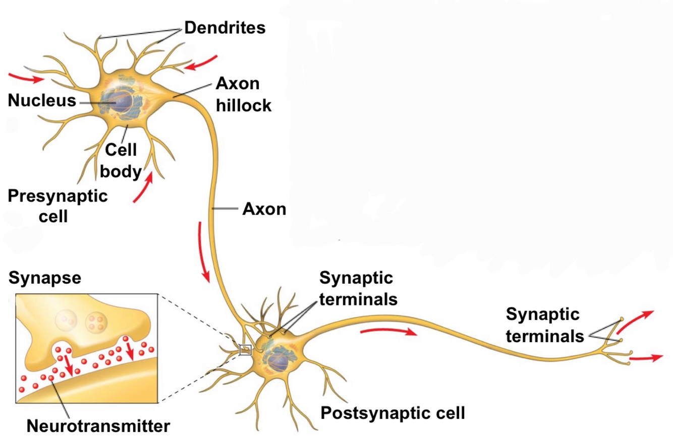Information is transmitted from a PRESYNAPTIC cell (a neuron) to a POSTSYNAPTIC cell like a neuron, muscle, or gland