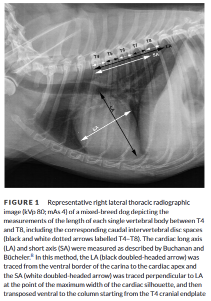 Similar to VHS - add together length and width of cardiac silhouette then keep subtracting length of one normal vertebra between T4-8 (including caudal interveretbral disc space)