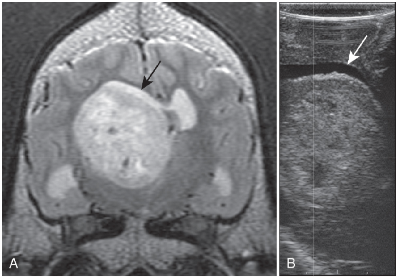 B, Intraoperative ultrasonography clearly defines the location and depth of the mass, and the overlying ventricle is seen as an anechoic rim dorsal to the mass (white arrow).