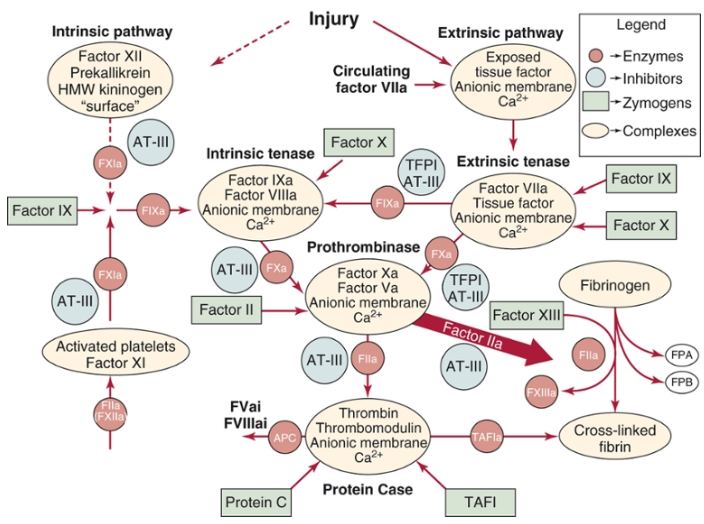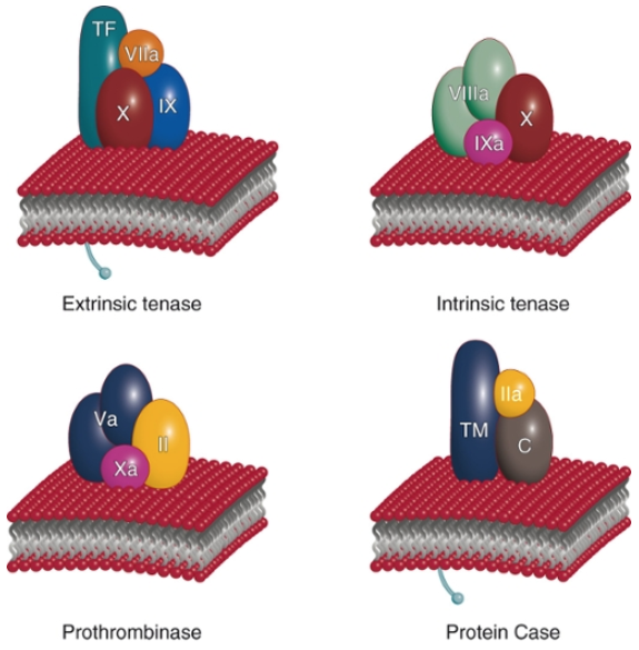 FIGURE 36.4 1) extrinsic tenase complex: factor 7a, TF 2) intrinsic tenase complex: factor 9a, 8a 3) prothrombinase complex: factor 10a, 5a 4) anticoagulant protein case complex: thrombin, TM