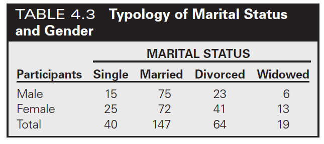 Example: typology on marital status could be partitioned into marital statuses in which a population is classified as married, divorced, widowed, or single. These discrete categories could be partitioned further to permit the classification of an additional variable in this typology. A typology of marital status and sex