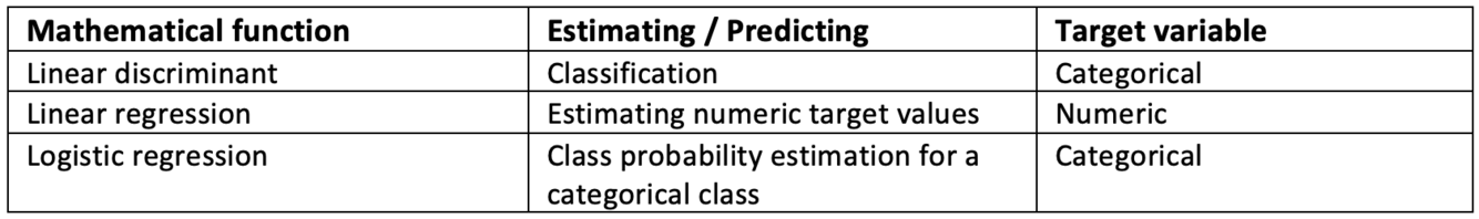 For Linear Discriminant, Linear regression and Logistic regression what do each estimate/predict and what is the target variable type?