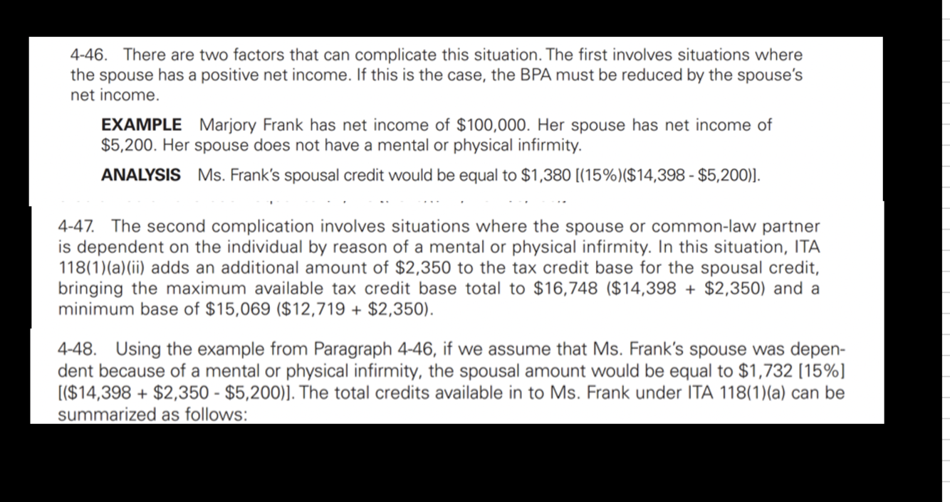 The formula of positive spousal net income: 15% * (BPA (Based off tax bracket) - Positive spousal net income)