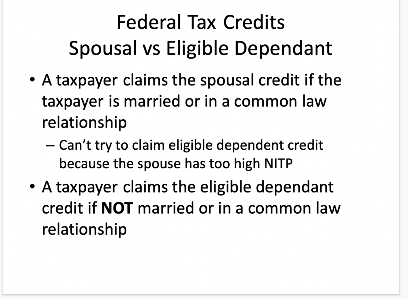 Spousal credit = Someone married or in a common law relationship.They can not claim eligible dependent credit.