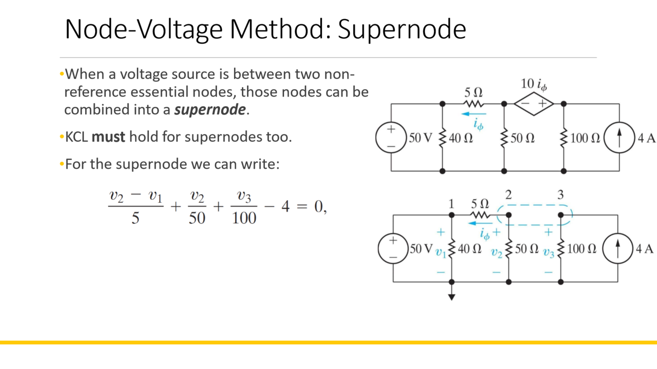 In circuit theory, a supernode is a theoretical construct that can be used to solve a circuit. This is done by viewing a voltage source on a wire as a point source voltage in relation to other point voltages located at various nodes in the circuit, relative to a ground node assigned a zero or negative charge