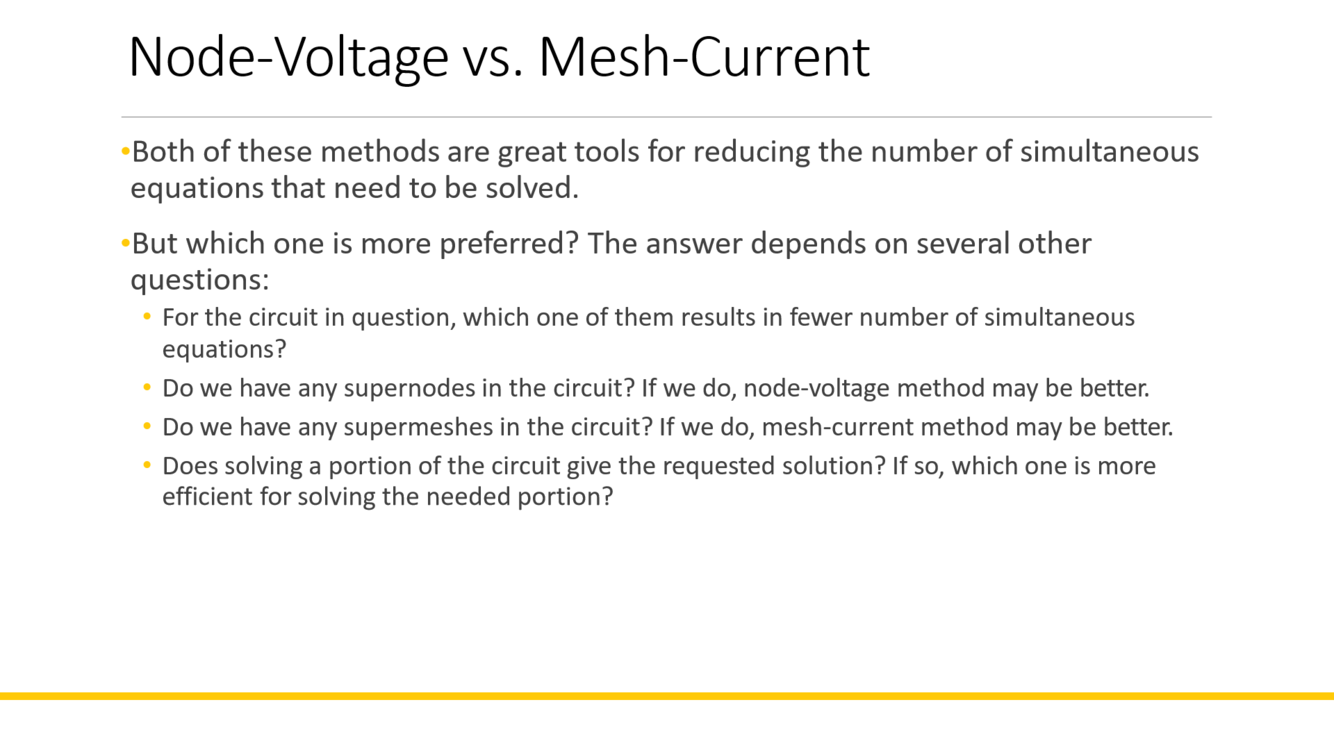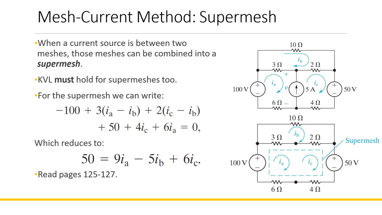 A supermesh occurs when a current source is contained between two essential meshes. The circuit is first treated as if the current source is not there. This leads to one equation that incorporates two mesh currents.