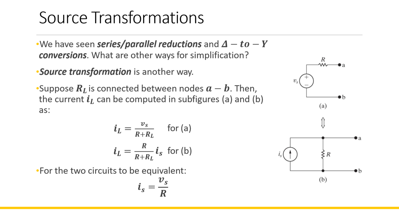 Source transformations allow us to exchange a voltage source (vs ) and a series resistor (R) for a current