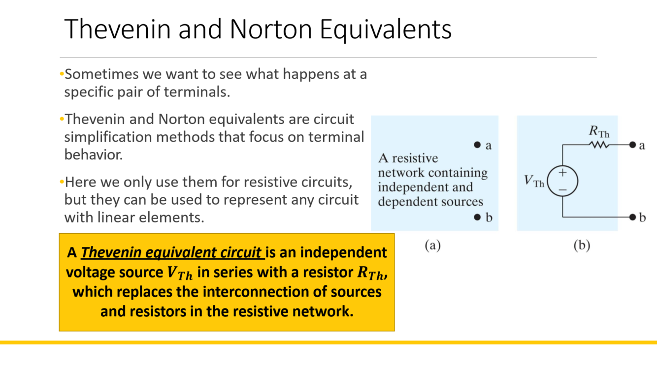 hévenin’s and Norton’s equivalent are circuit simplification techniques that focus on terminal behavior. This Theorem says that any circuit with a voltage source and a network of resistors can be transformed into one voltage source and one resistor.