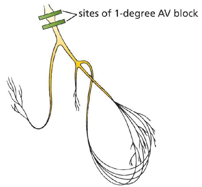 First-degree AV block. Note the prolonged PR interval.