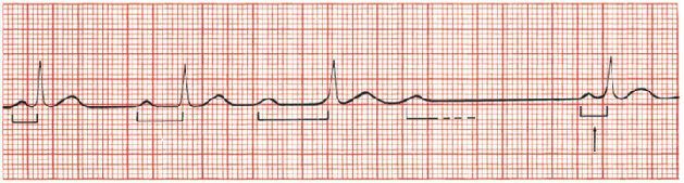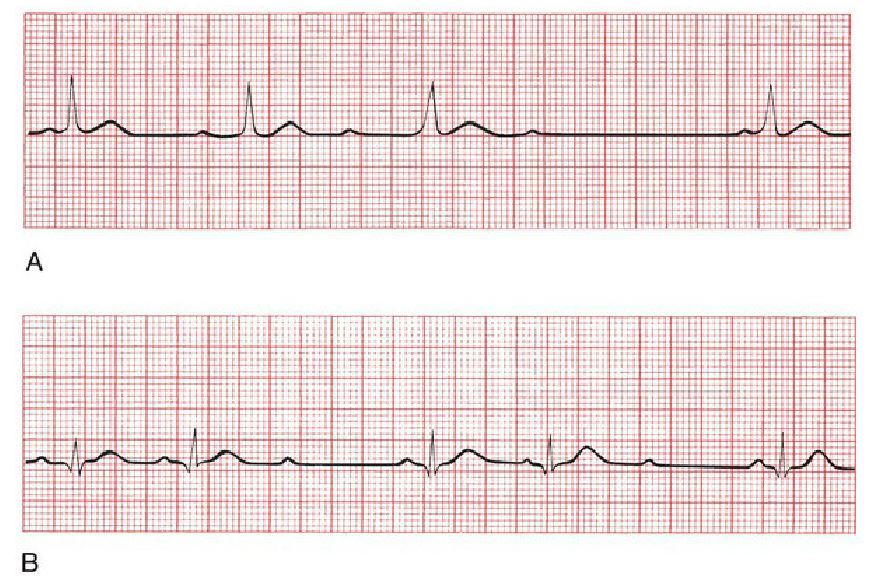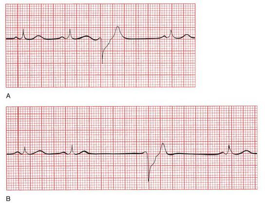 (A) The third beat is a PVC, occurring before the next anticipated normal beat. (B) The third ventricular complex occurs late, after a prolonged pause. This is a ventricular escape beat.