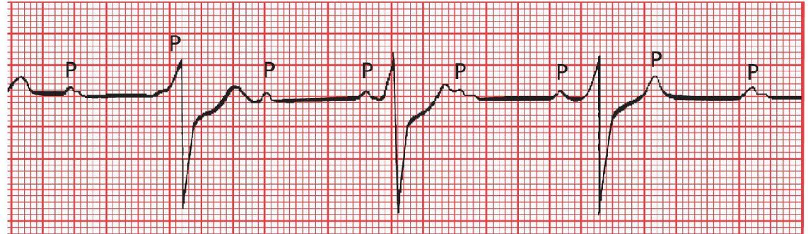 Third-degree AV block. The P waves appear at regular intervals, as do the QRS complexes, but they have nothing to do with one another. The QRS complexes are wide, implying a ventricular origin.