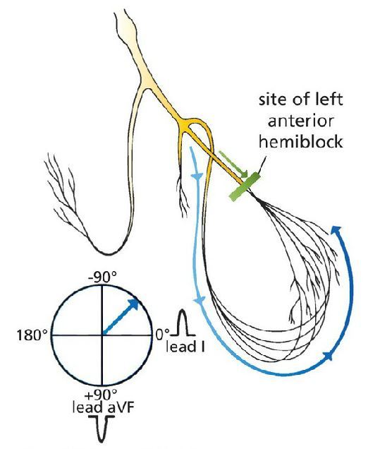 Left anterior hemiblock. Current flow down the left anterior fascicle is blocked; hence, all the current must pass down the posterior fascicle. The resultant axis is redirected upward and leftward (left axis deviation).