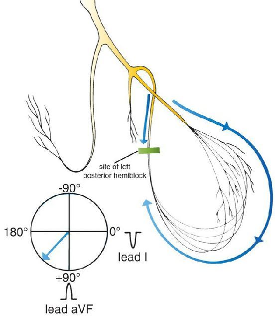Left posterior hemiblock. Current flow down the left posterior fascicle is blocked; hence, all the current must pass down the right anterior fascicle. The resultant axis is redirected downward and rightward (right axis deviation).