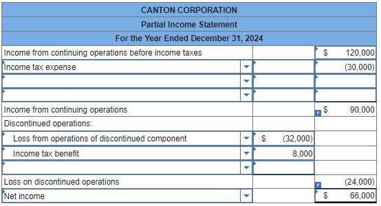 Prepare the December 31, 2024, income statement for Canton Corporation, starting with income from continuing operations before income taxes.