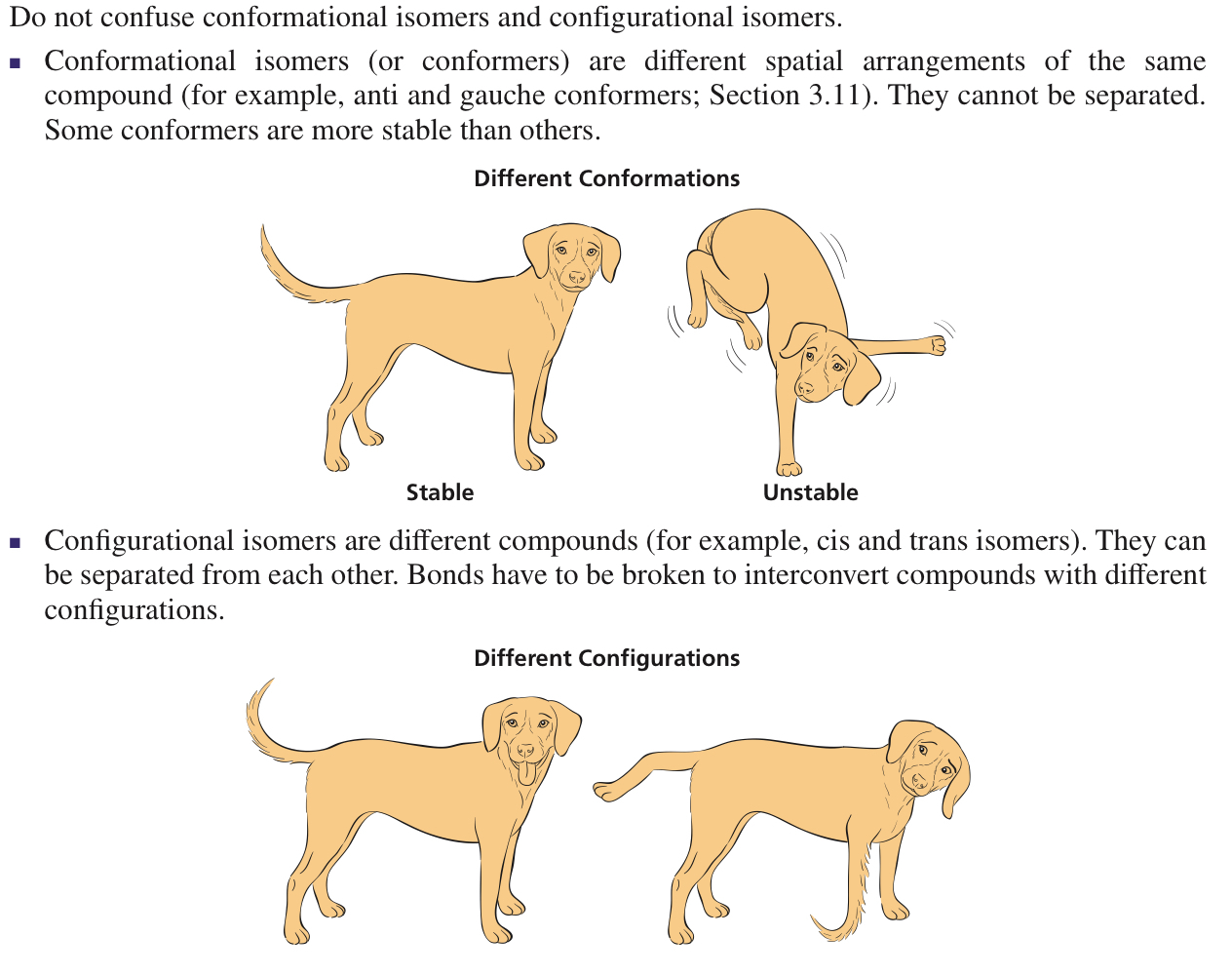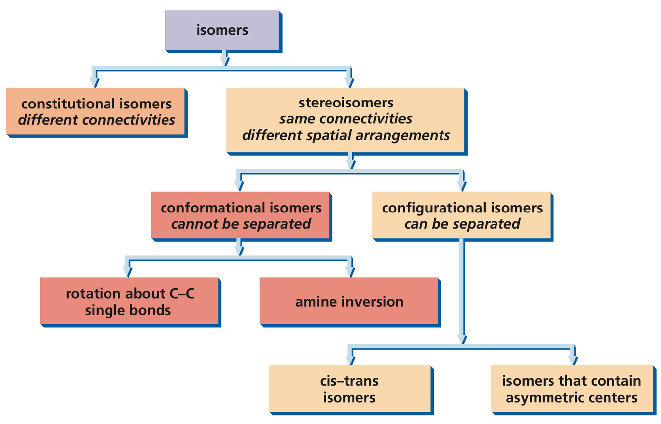 Configurational isomers: stereoisomers that cannot interconvert unless covalent bonds are broken. As a result, they can be separated.