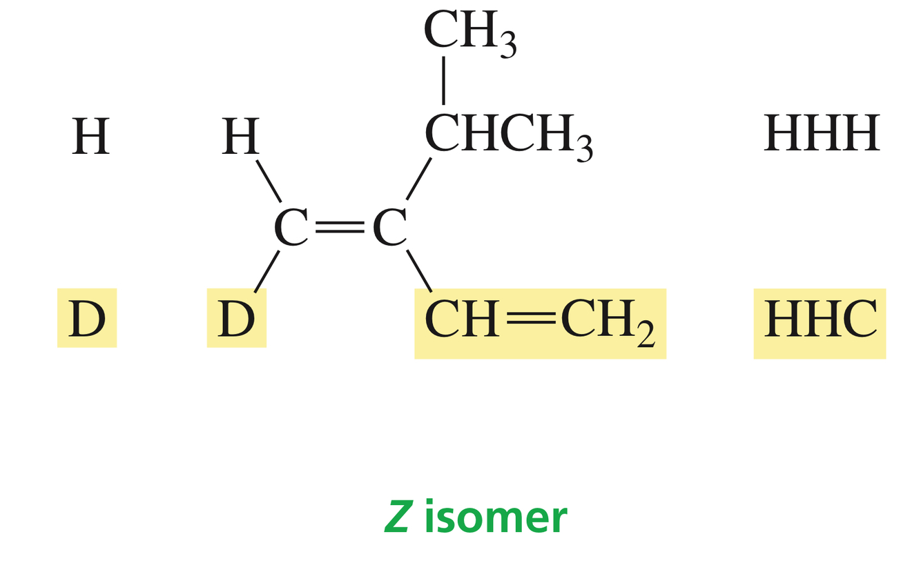 For example, in the isomer shown next on the left, the sp2 carbon on the left is bonded to a deuterium (D) and to a hydrogen (H): D and H have the same atomic number, but D has a greater mass number, so D has the higher priority.