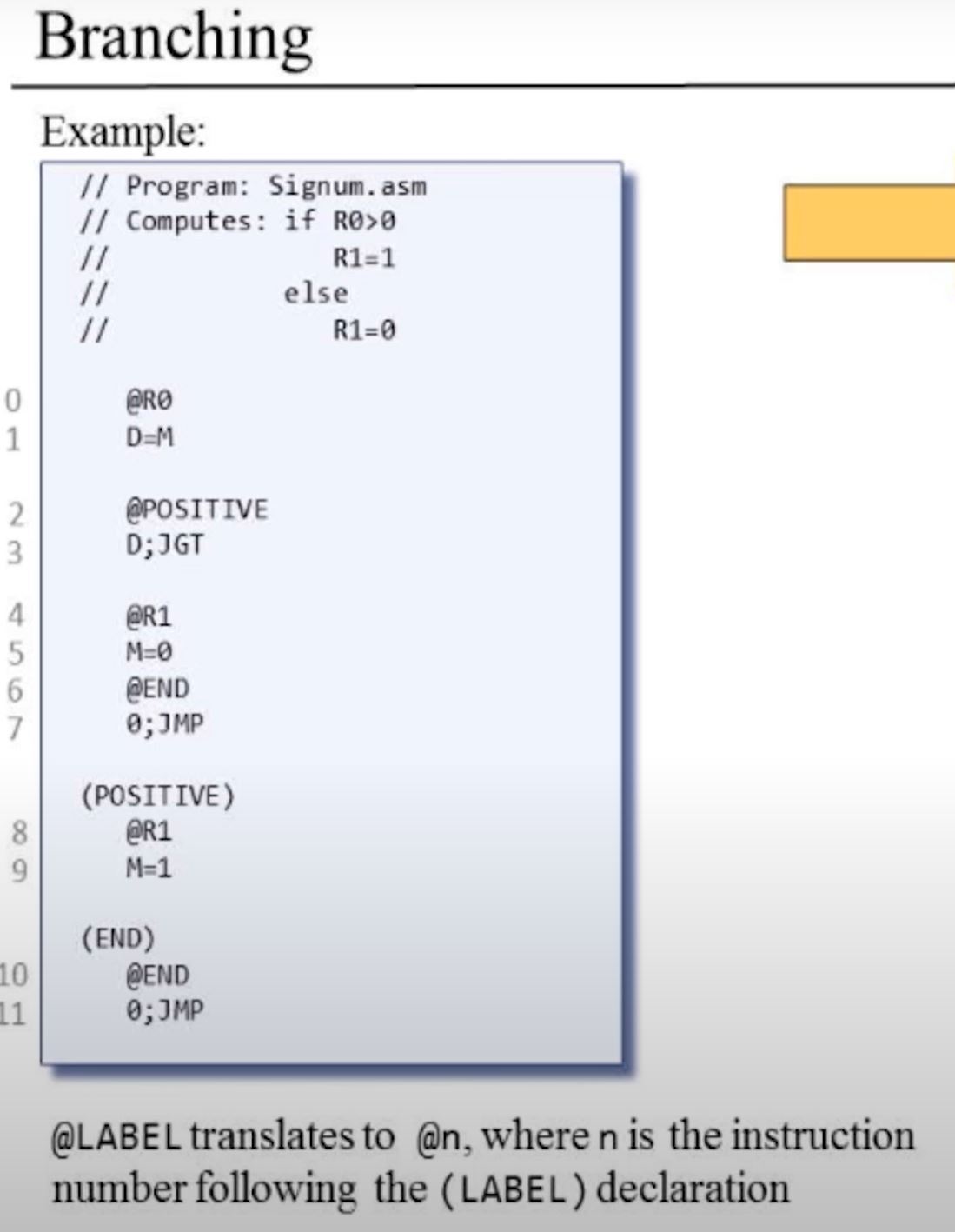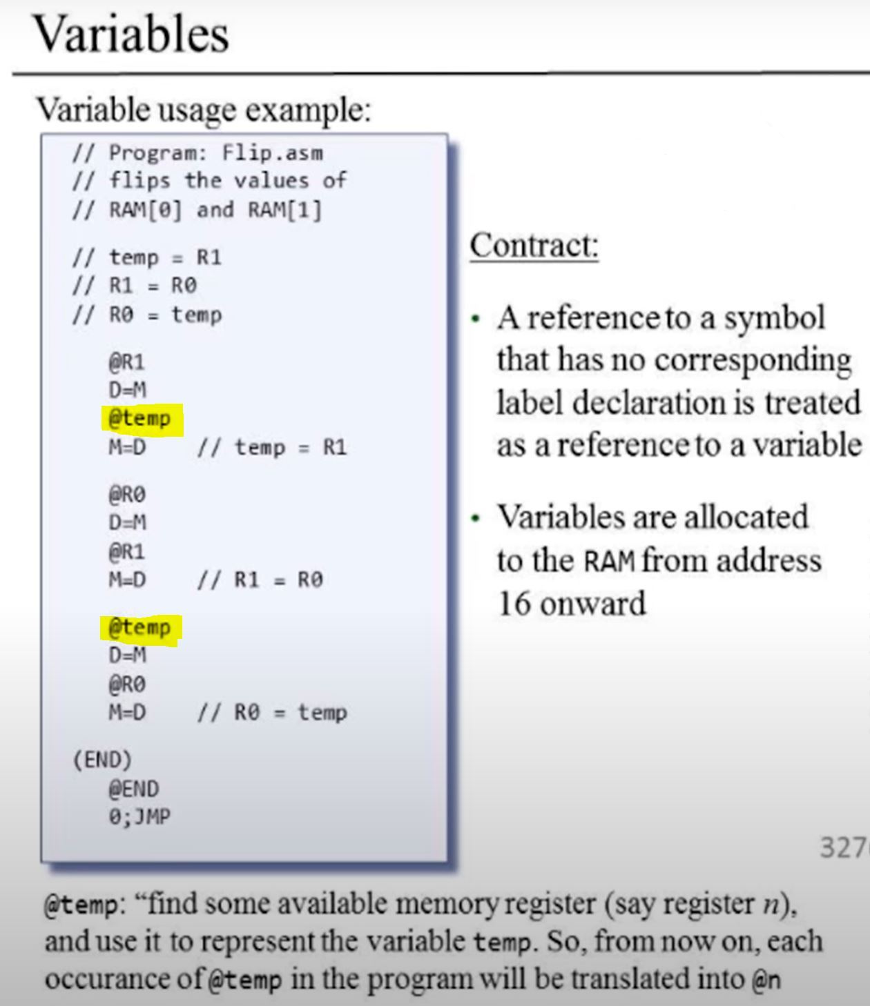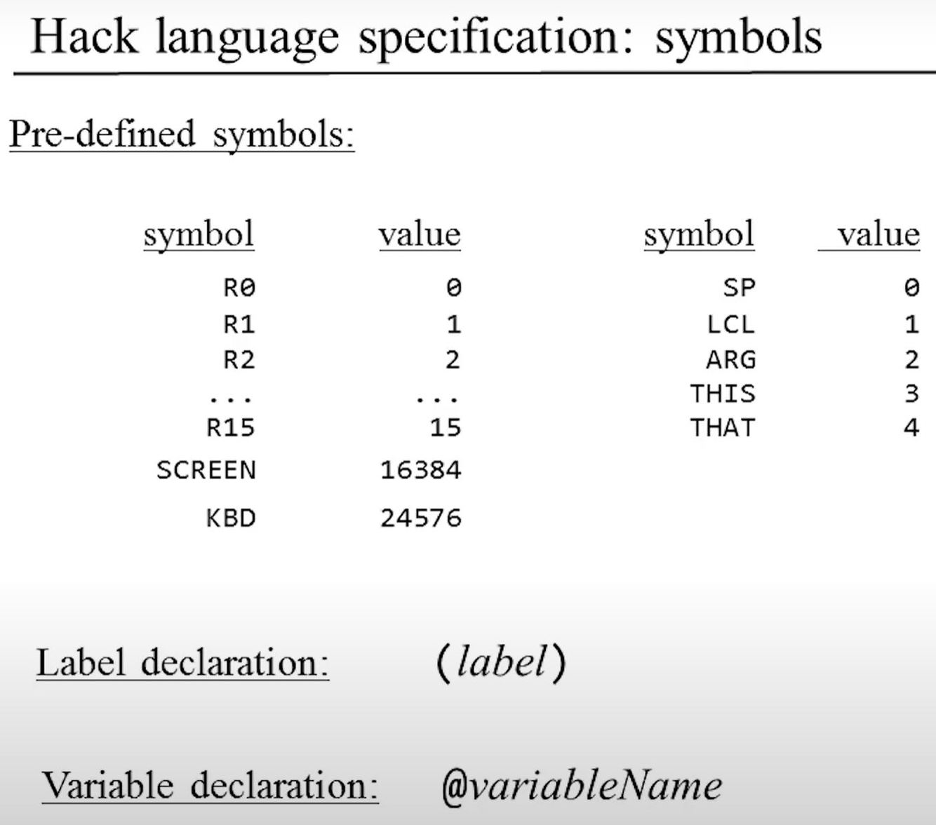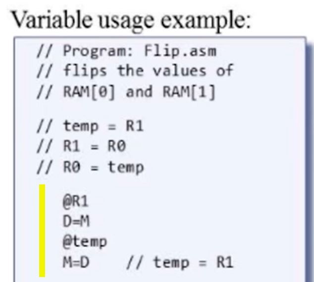 Variable symbols: Any user-defined symbol Xxx appearing in an assembly program that is not predefined and is not defined elsewhere using the ‘‘(Xxx)’’ command is treated as a variable, and is assigned a unique memory address by the assembler, starting at RAM address 16 (0x0010).