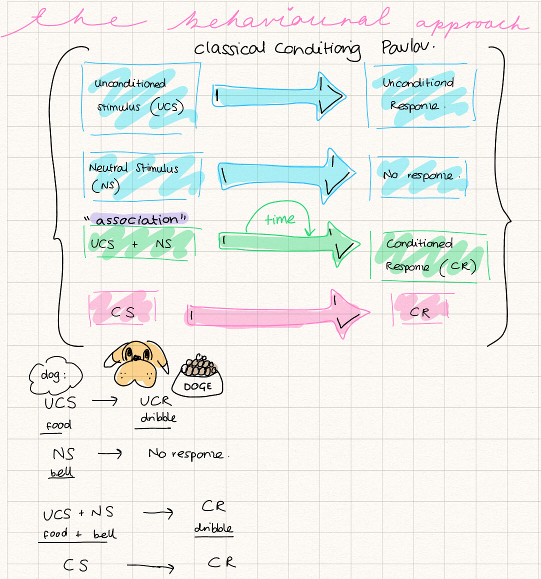 Learing occurs when 2 stimuli are associated with each other. Eventually, NS alone will produce same behavioural response as UCS.