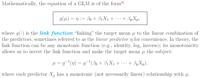 2) Relationship between the target mean and linear predictor - instead of equating the mean of the target variable directly with the linear combination of predictors, a GLM sets a function of the TARGET MEAN (important) to be linearly related to the predictors (target variable is left untransformed)