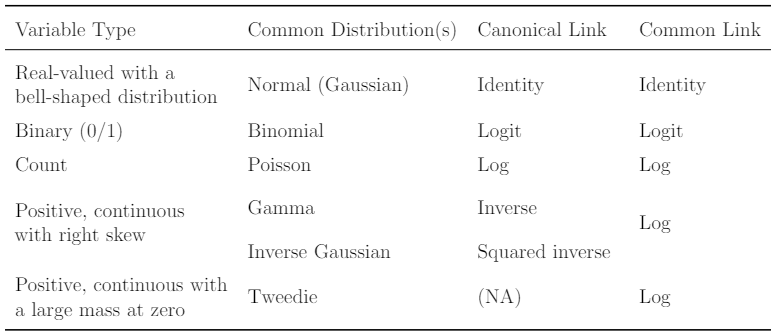 3) Canonical link associated with each target distribution - advantage of simplifying the mathematics of the estimation procedure and making it more likely to converge
