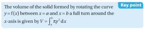 What is the formula for the volume of a solid, formed by rotating the curve y = f(x) between x = a/b, a full turn around the x-axis? ]