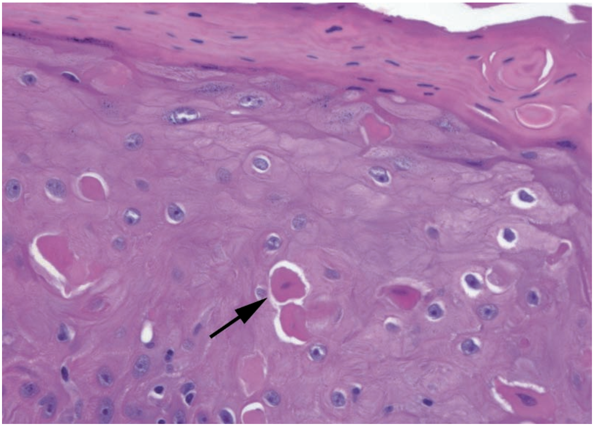 Arrowhead: Hyperkeratosis, clinically appearing as a white plaque