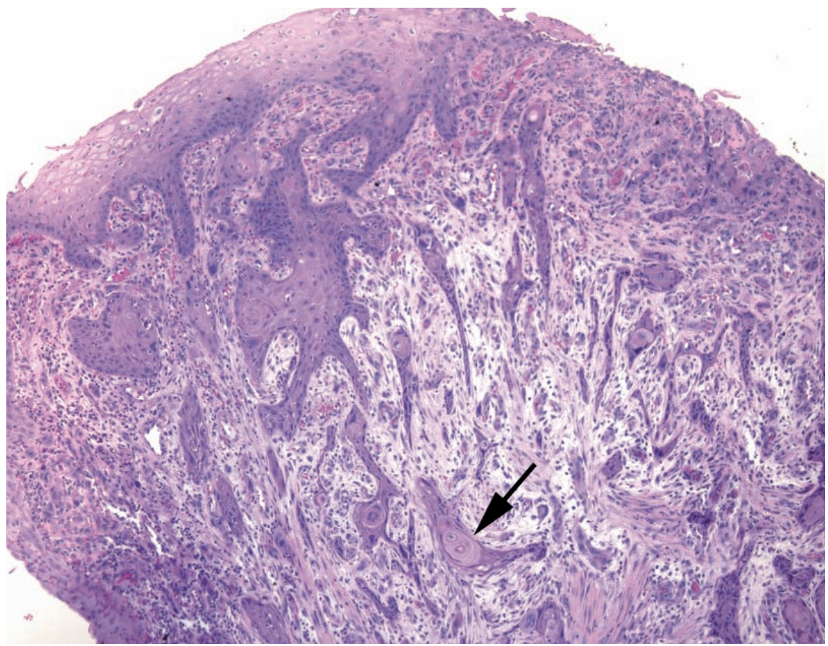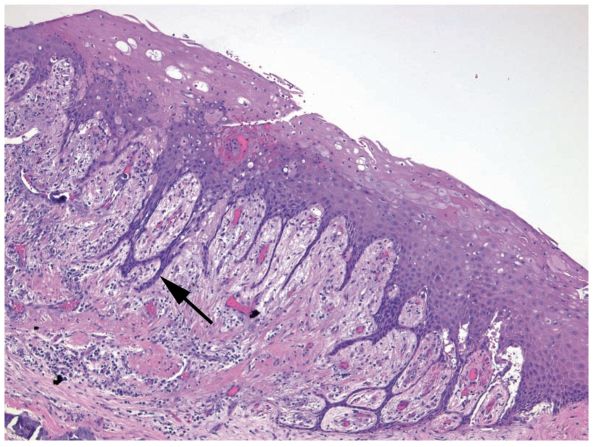 Arrow: Strands of epithelium pulled into the dermis or LP without keratinization or invasion.