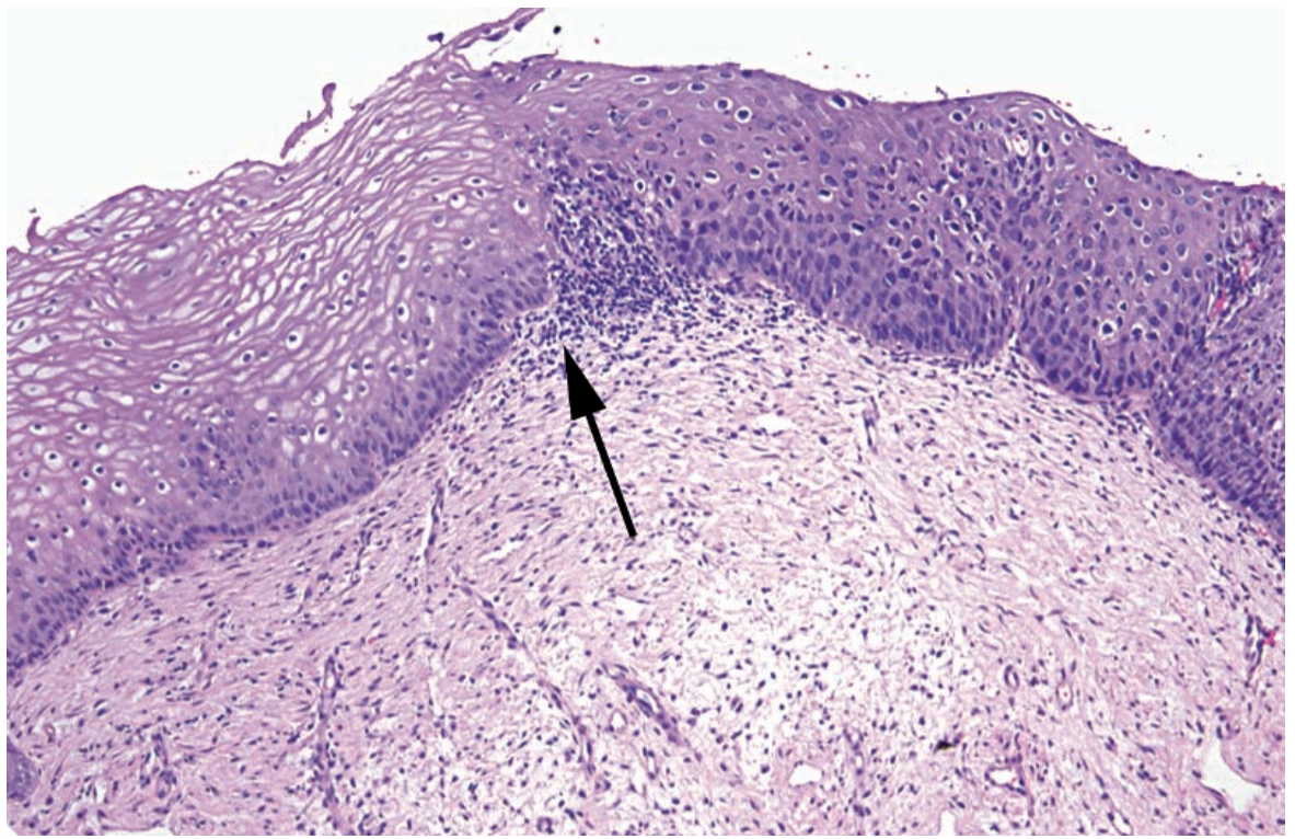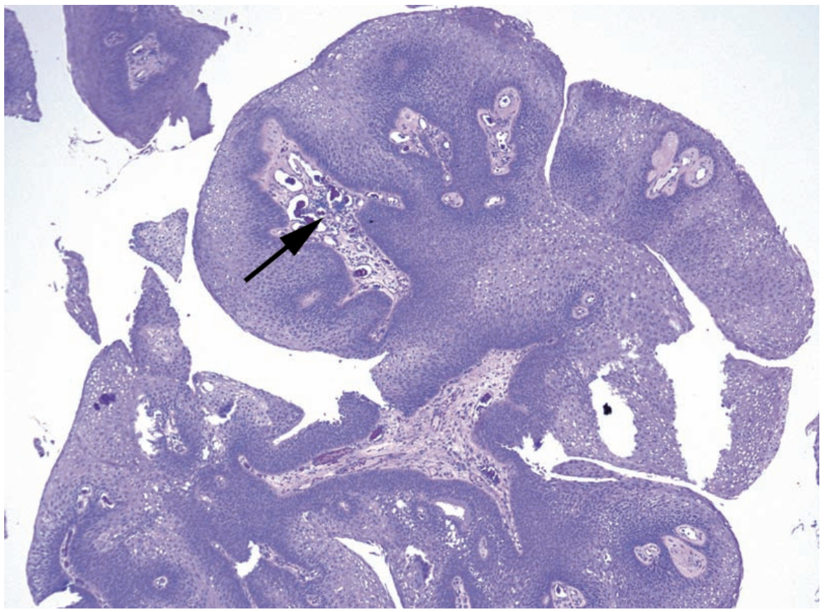 Arrow: Fibrovascular core surrounded by squamous epithelium.