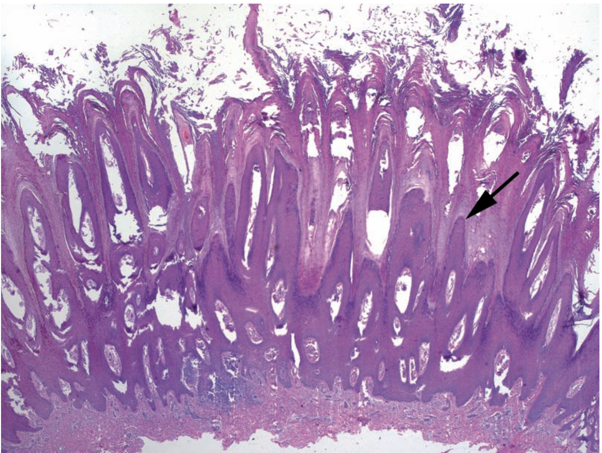Arrow: Exophytic spires with hyperkeratosis & parakeratosis