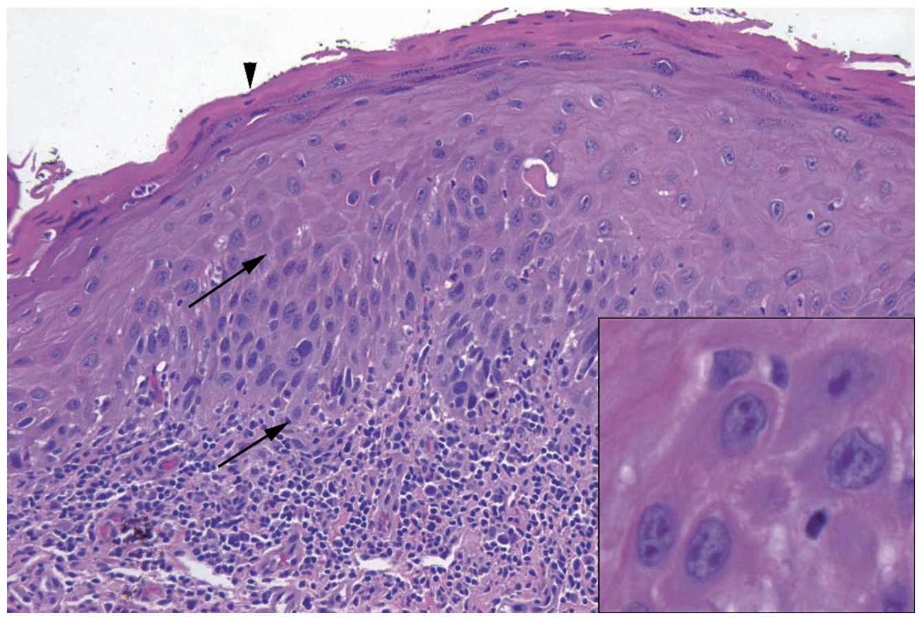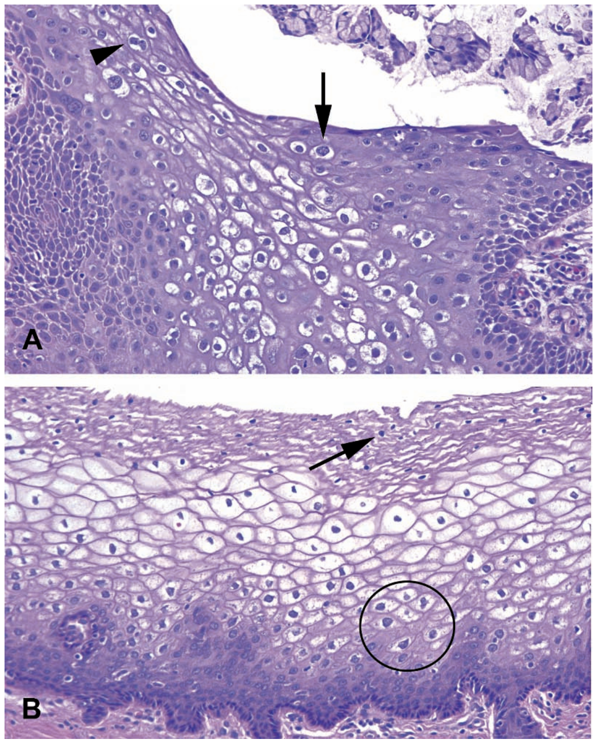 Top: Viral/koilocytic atypia with perinuclear halos (arrow) and binucleate cells (arrowhead)