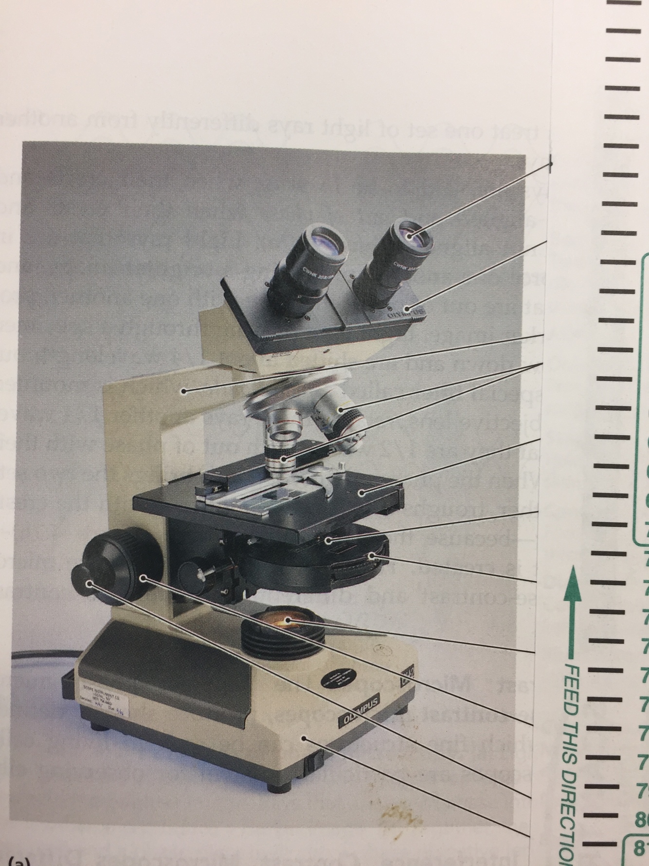 Name the parts of the following bright-field, compound light microscope below starting from the top: