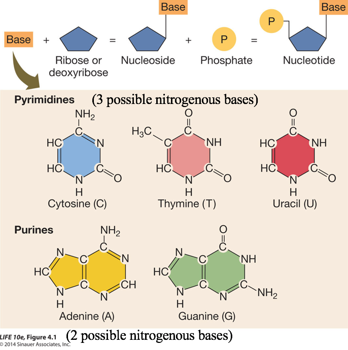 Adenine, thymine, uracil (RNA), guanine and cytosine;