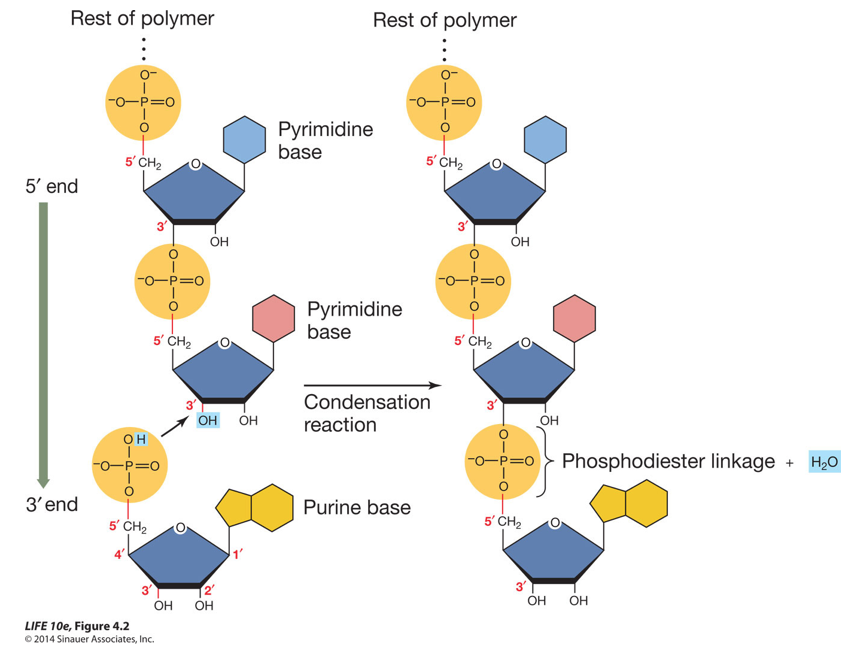 Nucleotides are linked together in a condensation/dehydration reaction to form a bond; the phosphate groups link Carbon 3’ in one sugar to carbon 5’ in another sugar; nucleic acids grow in a 5’-to-3’ direction