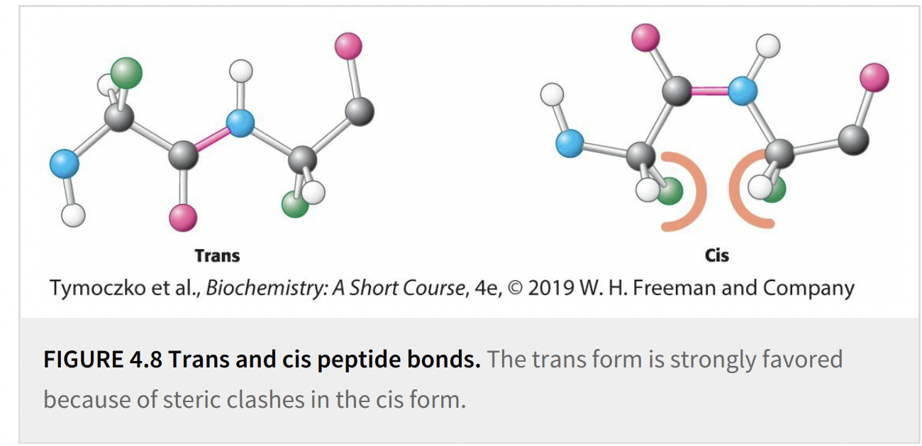 Almost all peptide bonds in proteins are —. This preference can be explained by the fact that there are —- between R groups in the —– configuration but not in the —- configuration.
