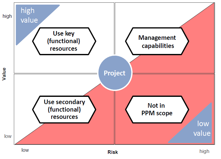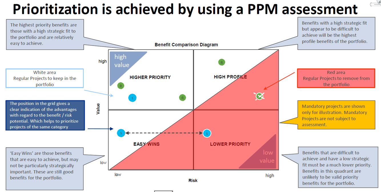 Normale Projekte: Gering Strategische Projekte: Hoch priorisiert durch das Project-Board, jedoch relativ Mittel gewichtet Pflicht Projekte: Regulatorische/Gesetzliche Vorgaben unda damit immer hoch