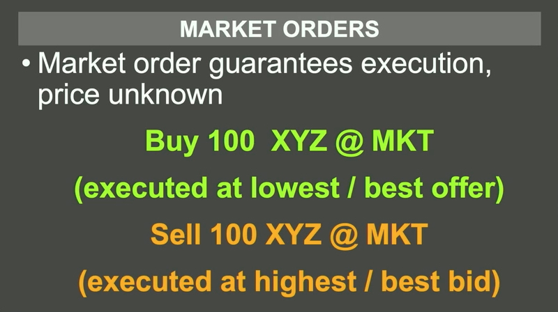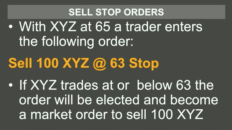 Sell 100 XYZ @ 63 Stop - If XYZ trades at or below 63, the order will be elected and become a market order.