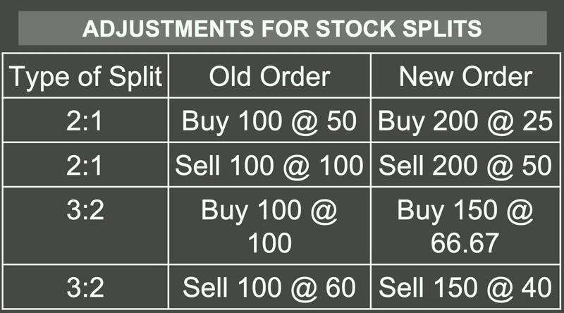 For shares, take the number of shares and multiply by the fraction (e.g. 3:2 stock split multiply shares by 3/2).