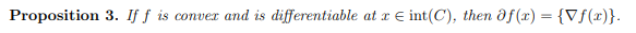 What is Proposition 3 regarding the value of ∂f(x) given f is convex and differentiable at x ∈ int(C)