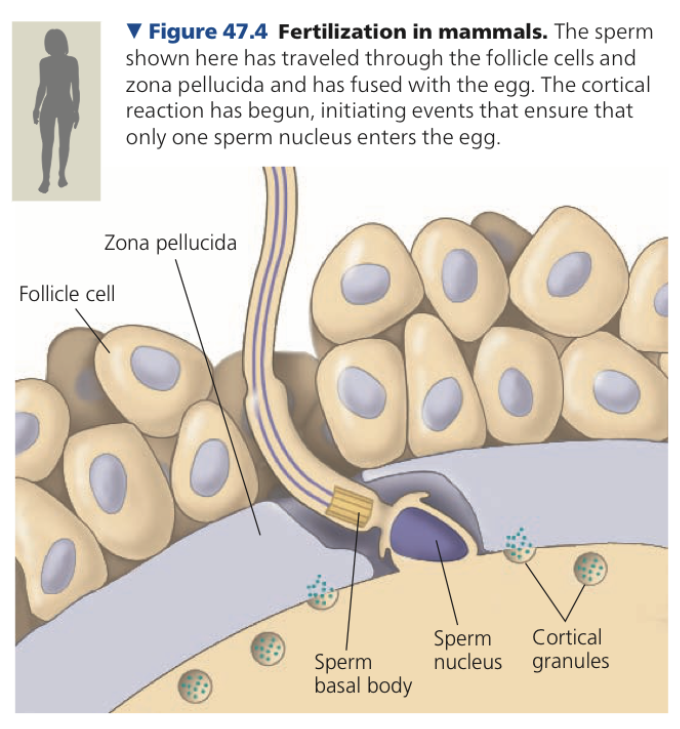 A sperm must travel through a layer of follicle cells surrounding the egg before it reaches the zona pellucida, or extracellular matrix of the egg