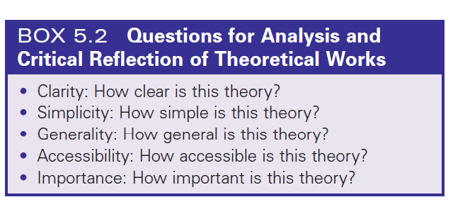 Generality: speaks to the scope of application and the purpose within the theory - generality of a theoretical work varies by how abstract or concrete it is - this has faciliatted the use of abstract frameworks and middle range theories - ( Example: Rogers’ (1986) theory of accelerating change is an example of an abstract theory from which numerous middle-range theories have been generated.