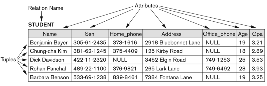 Determine which is the attributes, tuples, and relation name in the following figure: