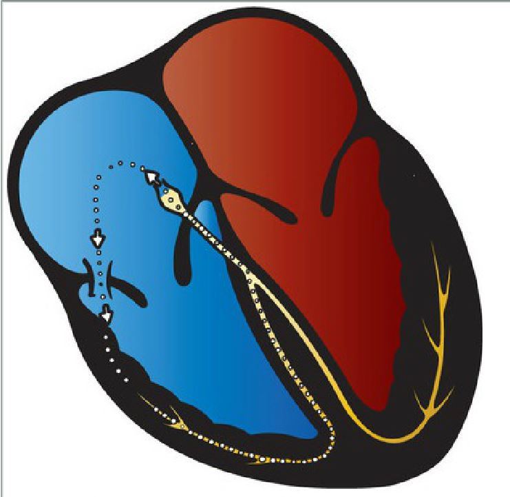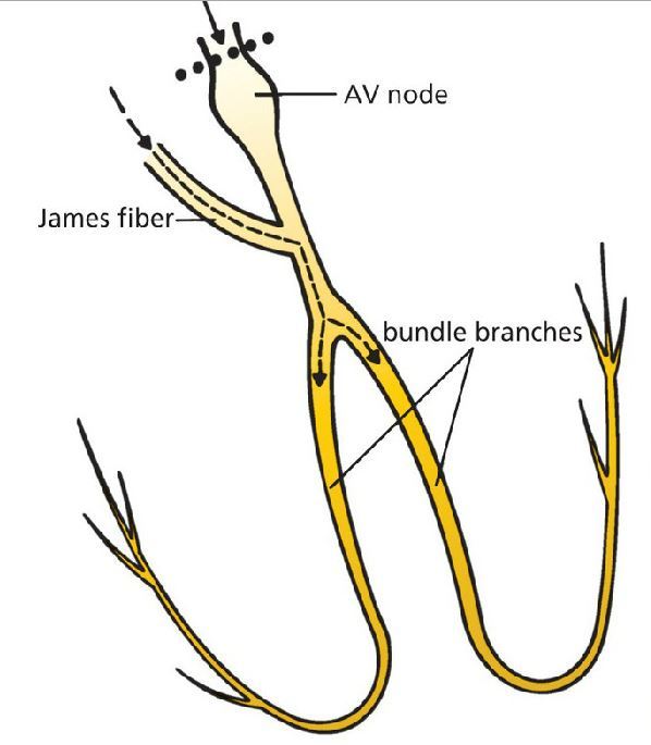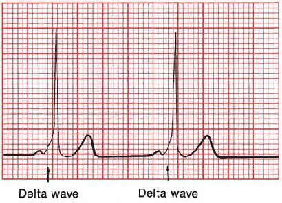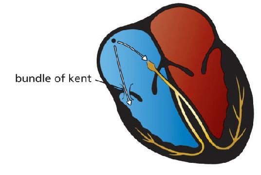 WPW syndrome. Current is held up by the normal delay at the AV node but races unimpeded down the bundle of Kent. The EKG shows the short PR interval and delta wave.