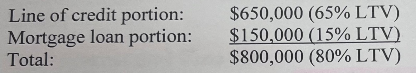 Example: Donald owns a home valued at $1,000,000. The maximum that can be disbursed under the HELOC is 80%, which equals $800,000. The bank breaks that amount down as follows:
