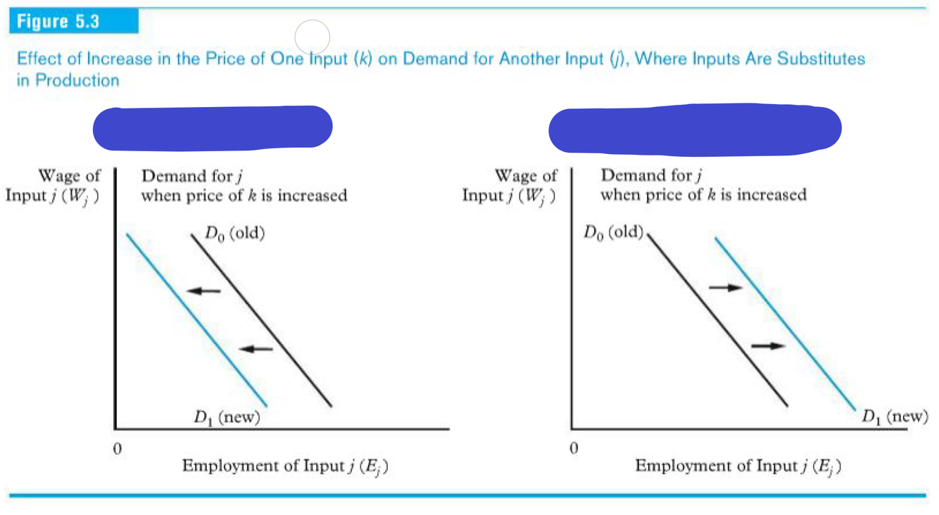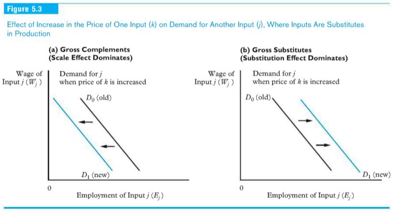 ● Substitute inputs: the greater use of one in producing output can compensate for reduced use of the other. Increases in price of the other input may shift the entire demand curve for a given category of labor either to right or left depending on strength of substitution and scale effects